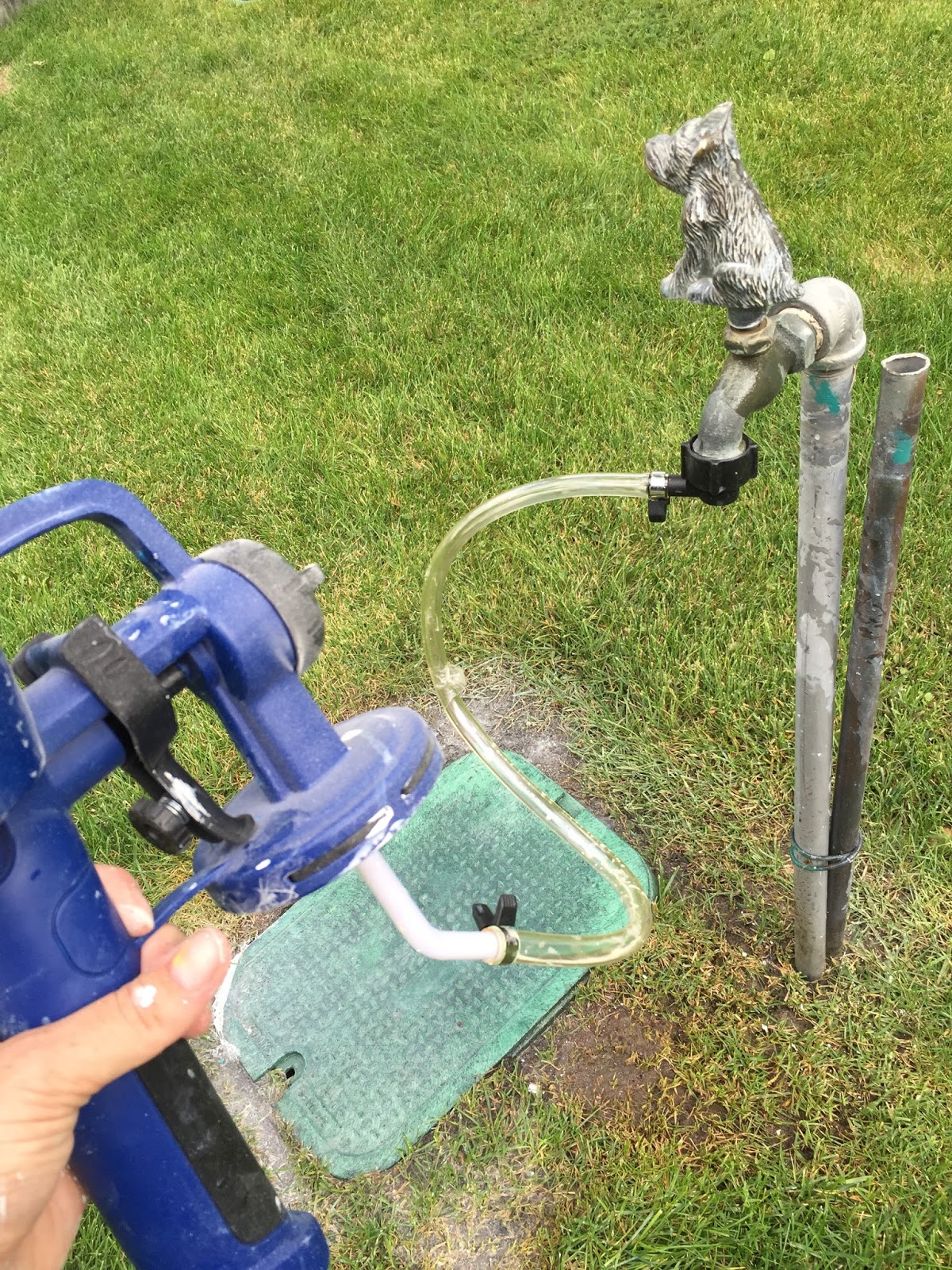 Once you are done painting, make sure to clean out your spray gun fast so the paint does not get stuck in there. The Home Right sprayer now has this awesome attachment that makes a quick and easy way to clean out your sprayer. Hook it up to your water, turn it on and it washes all the paint out.